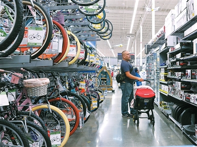 消费者在美国加利福尼亚州洛杉矶县一家沃尔玛商店内采购商品。