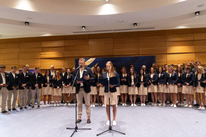 2025年7月17日,运动员在匈牙利代表团誓师大会上宣誓。新华社发(弗尔季·奥蒂洛 摄)