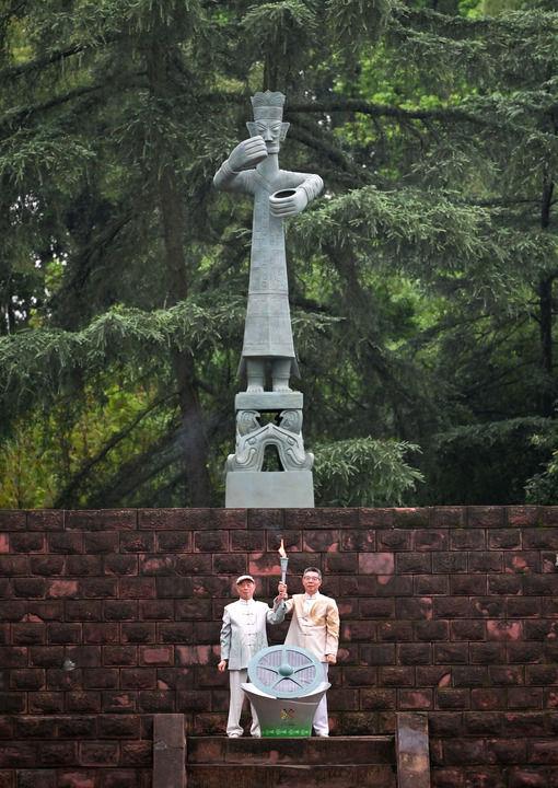 2025年7月26日,三星堆博物馆代表肖先进(左)、金沙遗址博物馆代表朱章义在火种采集仪式上展示火种。当日,第十二届世界运动会火炬传递活动在四川举行。新华社记者 刘坤 摄