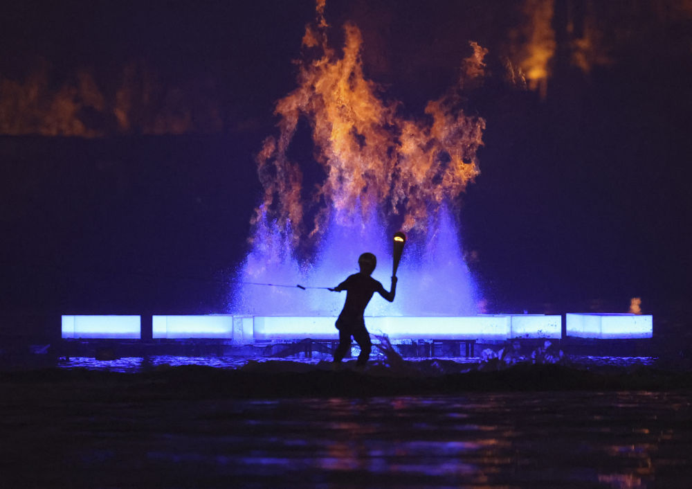 此次开幕式进行了世运会历史上第一次主火炬点燃仪式,主创团队经过多轮研讨,采取火在喷泉中燃烧作为主要创意点,通过精心设计,让天然气向上穿过水柱,实现节能燃烧。