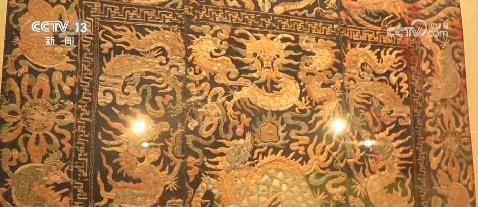 这件龙被上的纹饰由黄、白、蓝、三色线织绣而成,龙被是黎族织锦中集纺、染、织、绣四大工艺中难度最大的一个织锦艺术精品。
