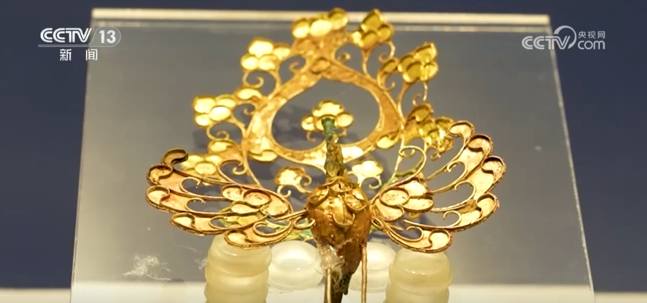 白居易在《长恨歌》中写到:云鬓花颜金步摇,芙蓉帐暖度春宵。这件同样来自陕西历史博物馆的凤形包金银步摇就是诗中提到的金步摇,行走时摇曳生姿,故称“步摇”。