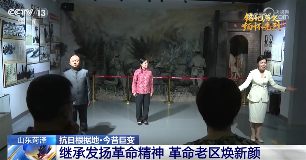 80多年过去了,革命前辈们的精神在冀鲁豫大地上被继承和发扬。正在纪念馆里表演的是菏泽市郓城县抗日红色情景剧《亲娘》,讲述郓城数十位乳娘将革命遗孤抚养长大的故事。现在,菏泽市每年演出红色话剧、情景剧等270余场次,进行红色宣讲400余场次,深受广大干部群众喜爱。