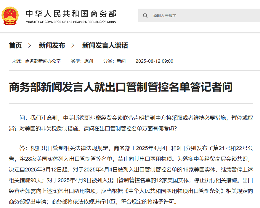 答:根据出口管制相关法律法规规定,商务部于2025年4月4日和9日分别发布了第21号和22号公告,将28家美国实体列入出口管制管控名单,禁止向其出口两用物项。为落实中美经贸高层会谈共识,决定自2025年8月12日起,对于2025年4月4日被列入出口管制管控名单的16家美国实体,继续暂停上述相关措施90天;对于2025年4月9日被列入出口管制管控名单的12家美国实体,停止执行相关措施。出口经营者如需向上述实体出口两用物项,应当根据《中华人民共和国两用物项出口管制条例》相关规定向商务部提出申请;商务部将依法依规进行审查,符合规定的将准予许可。