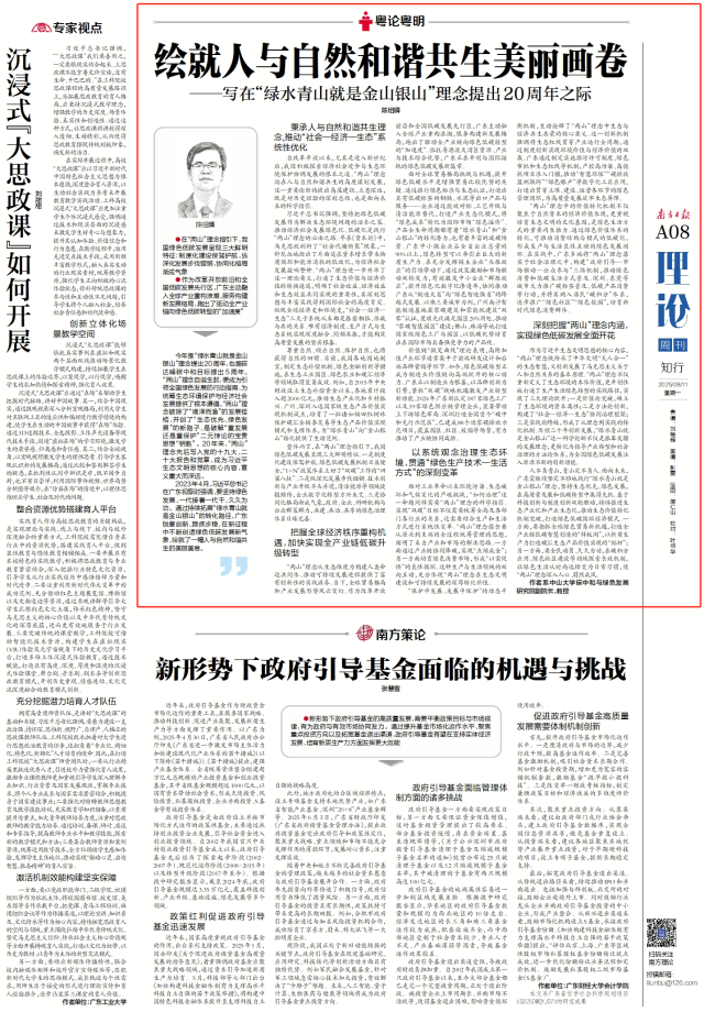 “两山”理念从生态维度为构建人类命运共同体、推动可持续发展进程提供了富有创新性的实践滋养。当下,全球贸易格局和产业发展形势风云变幻。作为改革开放前沿和全国低碳发展先行区,广东主动融入全球产业重构浪潮,服务构建新发展格局,跑出了驱动全产业链向绿色低碳转型的“加速度”。依托粤港澳大湾区资源、产业与技术综合优势,广东正在开创与国际接轨的绿色低碳发展新篇章。