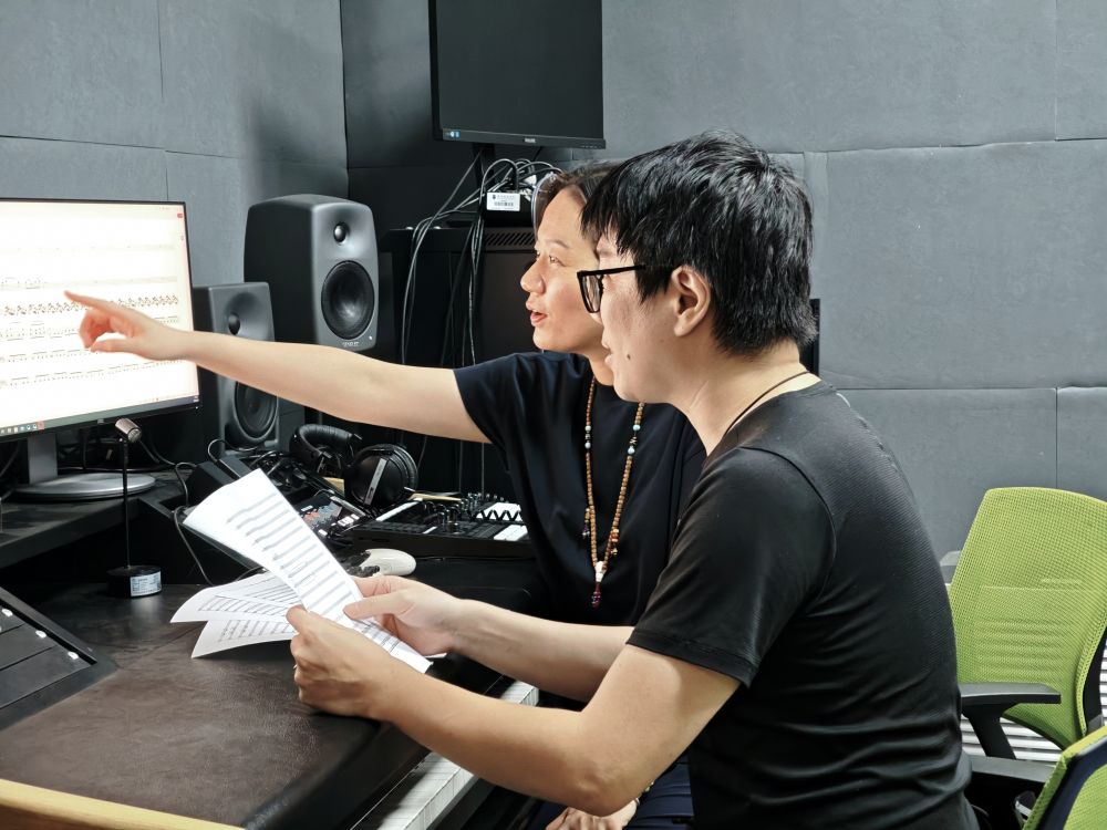 团队主创成员王欣、王子堃(前)在讨论修改乐谱。(受访者供图)