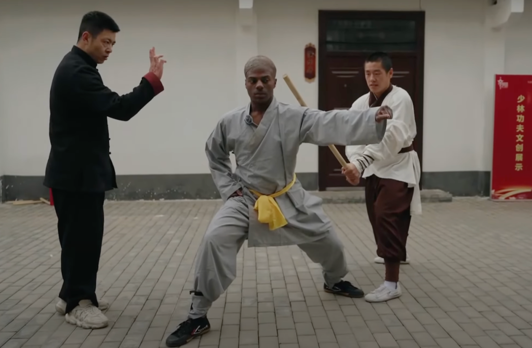 向一位身着黑衣黑裤的瘦削男子高喊着