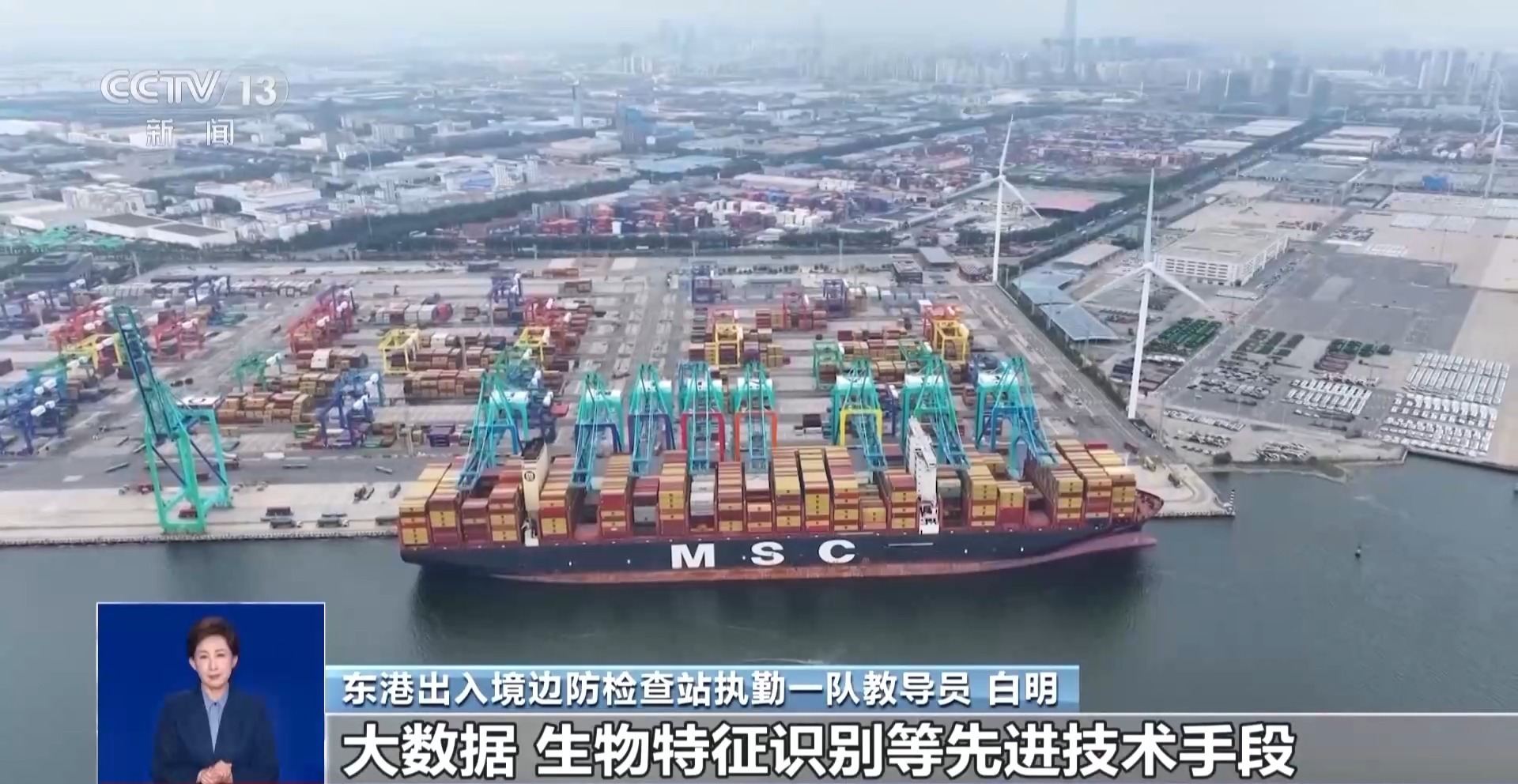 东港出入境边防检查站执勤一队教导员 白明:我们综合运用数字孪生、人工智能、大数据、生物特征识别等先进技术手段,在全国率先实现口岸全时空智能监管、全要素精准感知、港口边检行政许可全天候受理,助力天津港与上合组织成员国的贸易通道更加顺畅。