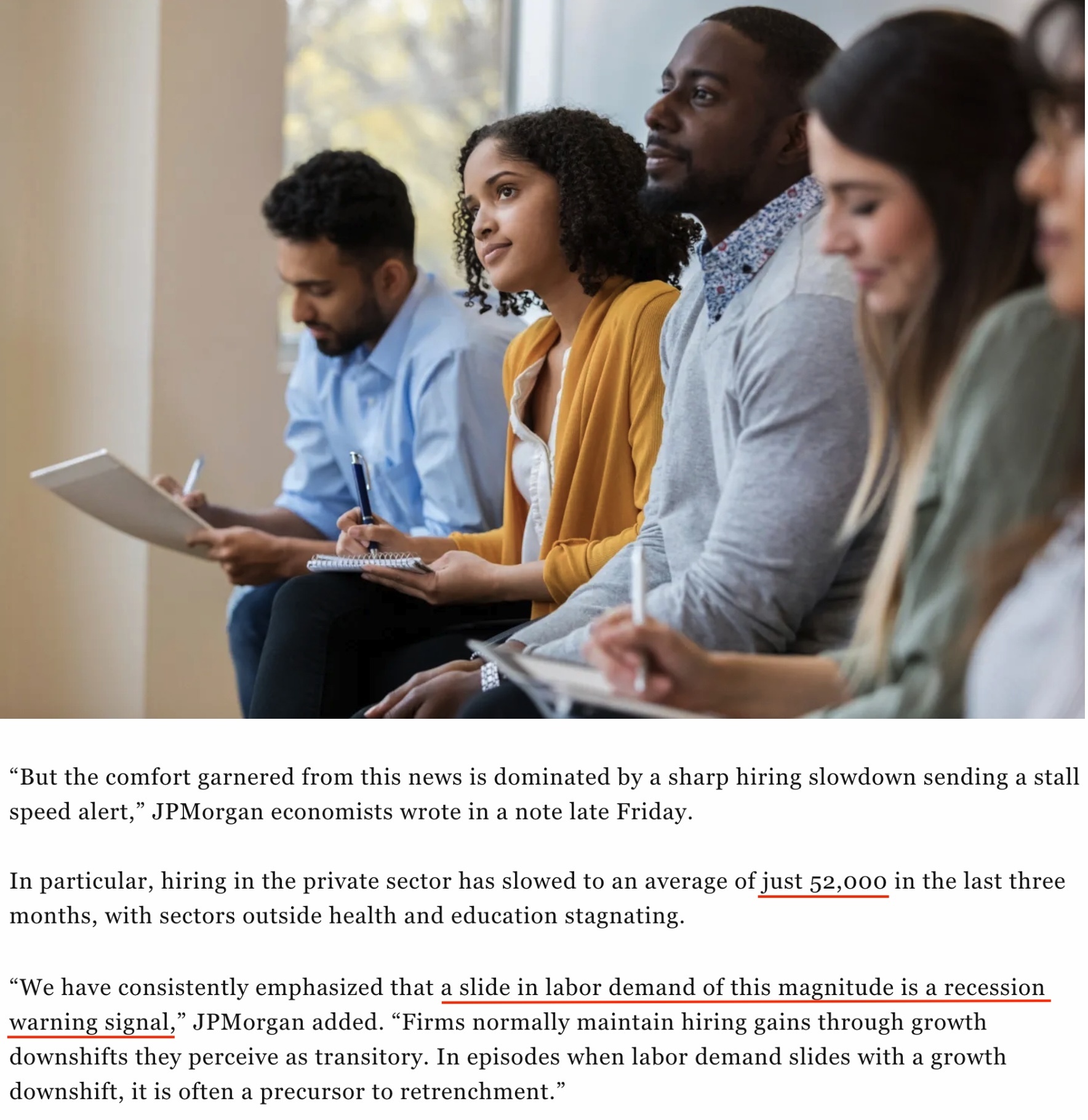 另据摩根大通银行经济分析师最新发布的研究报告,美国私营部门过去三个月的招聘人数减少至平均5.2万;除医疗和教育领域外,其他行业的招聘均已停滞。