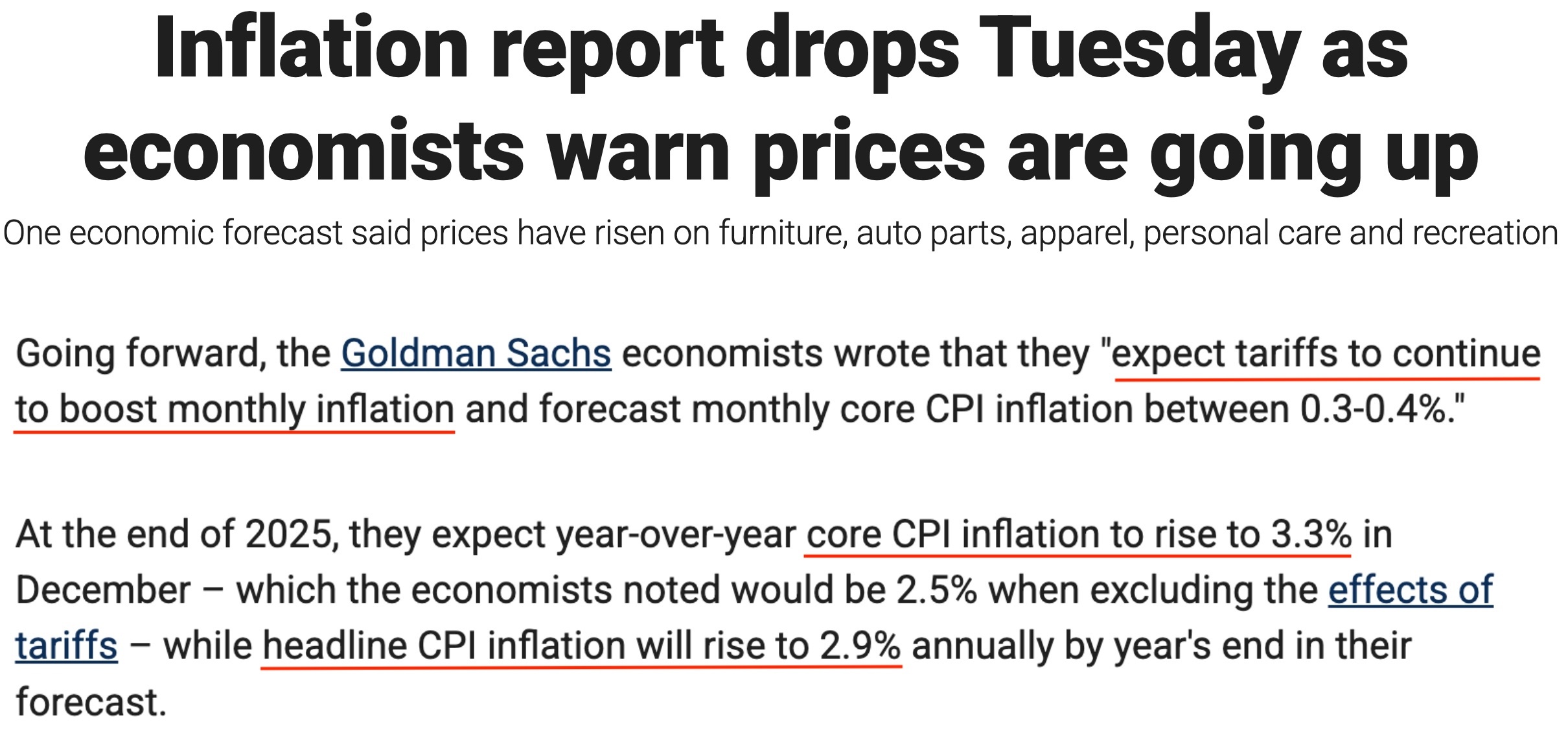 他认为,由于关税对通胀的助推作用,7月CPI数据将开启一个持续数月的上升趋势。到今年年底,美国核心CPI将同比大幅上涨3.5%。