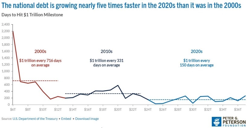 据其统计,在本世纪第一个十年,美债每增加1万亿美元平均需要近两年(716天);在本世纪第二个十年,这一时间缩短到了不到一年(331天);而到了目前所处的本世纪第三个十年,美债平均不到半年(150天)就会跨越一个万亿美元级大关。