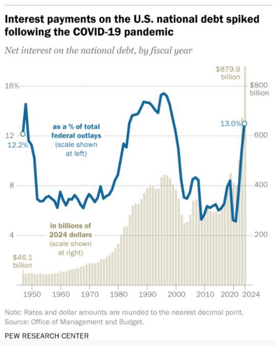 随着债台越筑越高,美国政府2024财年支付的净债息已达到8799亿美元,占当年财政总支出的13%,不仅创下25年来的最高比例,而且超过了医保支出(8741亿美元)和军费支出(8735亿美元)。