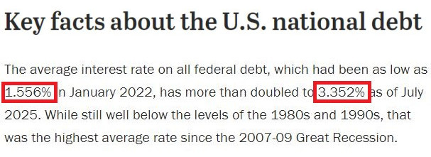 △美国皮尤研究中心的调查显示,美联邦债务的平均利率在美联储激进加息前的2022年1月曾低至1.556%,而到今年7月已翻了一倍多,达到3.352%,也是自2007-2009年大衰退以来的最高平均利率水平。