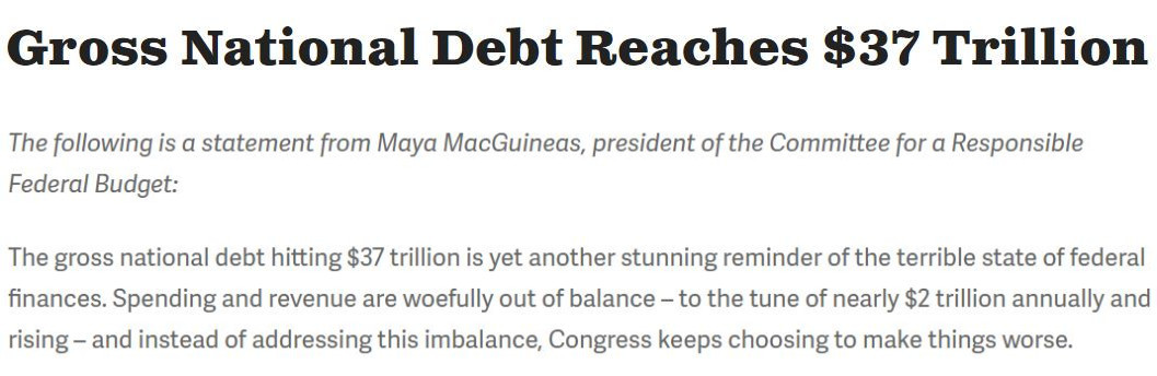 “(美国)国家债务总额达到37万亿美元的现实再次令人震惊地凸显出联邦财政的糟糕状况。支出和收入严重失衡每年造成近2万亿美元的财政赤字,然而美国国会不仅没有解决这种财政失衡,反而一直选择让事情变得更糟。”