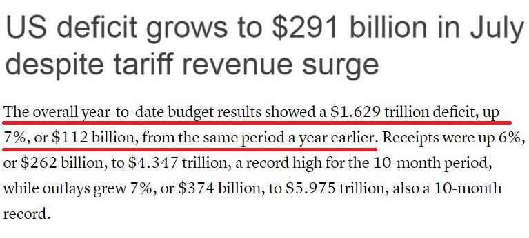 而从本财年(2024年10月1日至2025年9月30日)的整体情况来看,在截至7月的前十个月,美政府累计财政赤字已达1.63万亿美元,同比增长了7%。