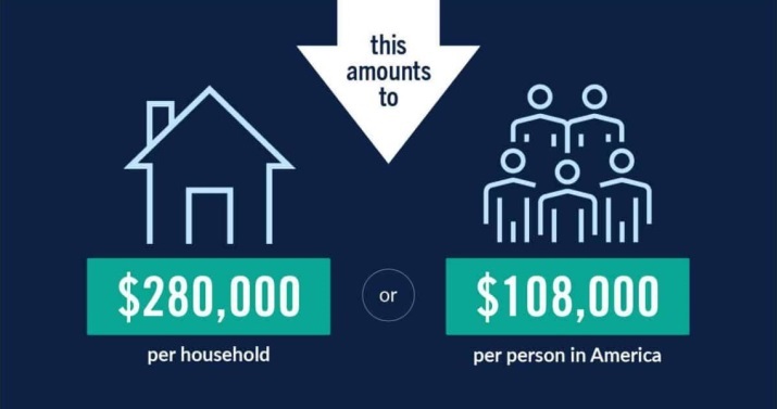 彼得森基金会给出惊人结果:如果将债务分摊给美国民众,相当于每户家庭负债28万美元,每个人负债10.8万美元。