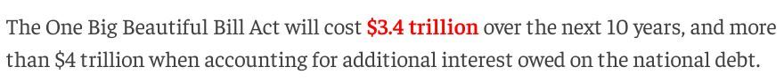 根据美国国会预算办公室(CBO)上月做出的评估,“大而美”法案预计将在未来十年使美联邦政府财政赤字增加约3.4万亿美元;如果算上同期的额外美债利息,新增赤字更是将超过4万亿美元。