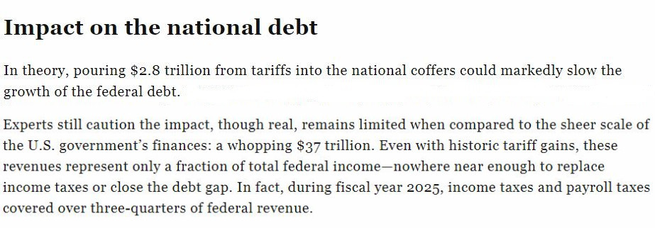 虽然美国政府确实从其滥施的关税中“赚”了一笔,但专家们仍然警告指出,与37万亿美元的庞大美债规模相比,关税收入实属九牛一毛。即使加上历史上的关税收益,它们也只占联邦总收入的一小部分,远不足以取代所得税或缩小债务缺口。