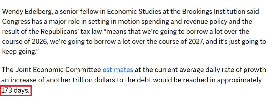 据美国国会联合经济委员会估计,按照目前的日均增长速度,美债总额将在大约173天内再增加1万亿美元。