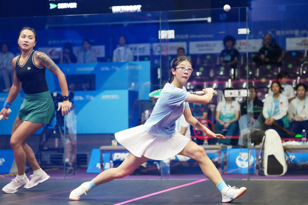 8月9日,中国选手殷子媛(右)在壁球女子单打16强遗材赛中击球。新华社记者 李旭伦 摄