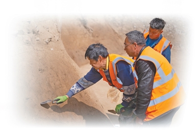 考古人员在对琉璃河遗址夯土建筑基址剖面进行清理。