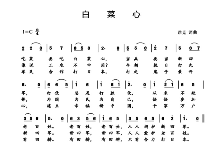 “平日里常常看见老乡送子参军、老奶奶为战士缝补棉被,父亲很受触动,很快就创作了《白菜心》,没想到教唱之后,很快在江南地区和华中各抗日根据地传唱开来。”凃克之子凃申生介绍说。