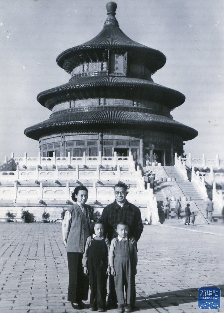 20世纪50年代末,梅汝璈(后右)与妻子萧侃(后左)、儿子梅小璈(前右)、女儿梅小侃(前左)在北京天坛公园合影(资料照片)。