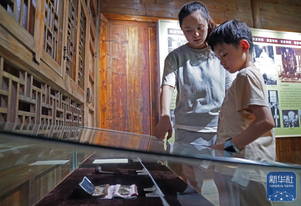 2025年8月1日,一名家长(左)带孩子在梅汝璈故居参观梅汝璈在东京审判时期用过的物品。