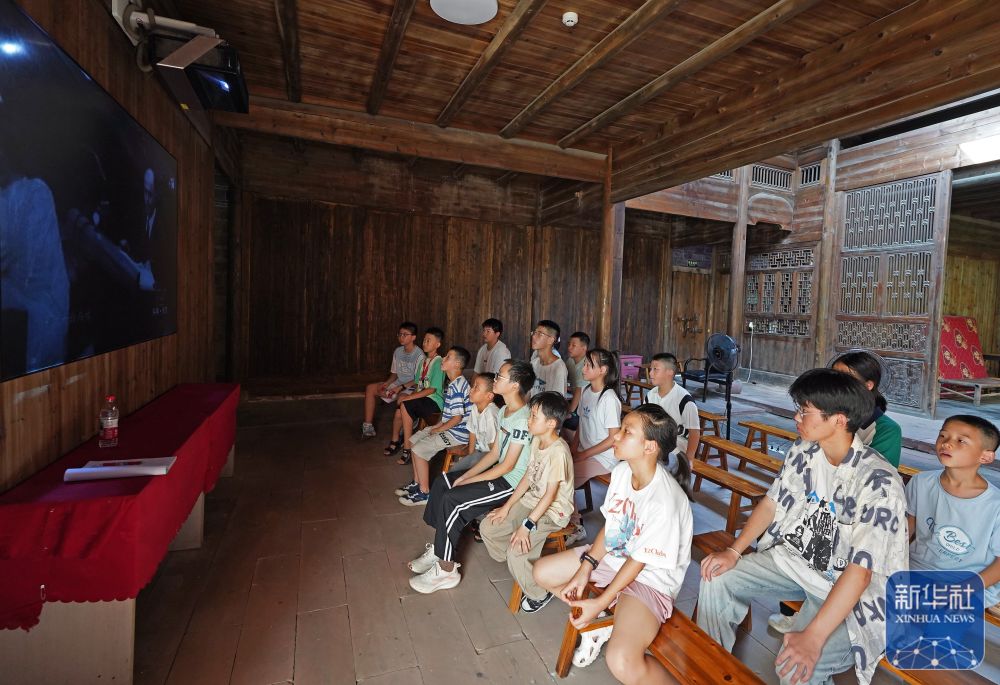 2025年8月1日,孩子们在梅汝璈故居观看东京审判纪录片。