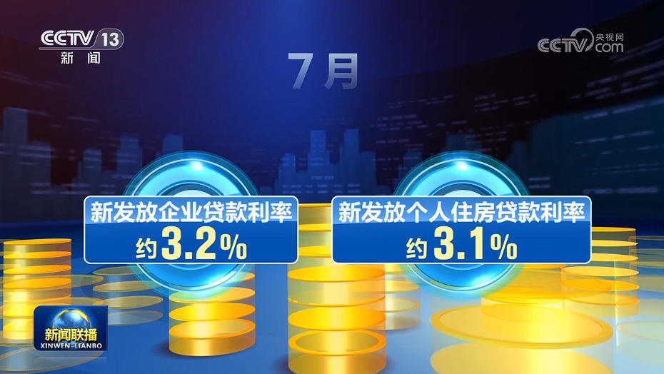 7月,贷款利率保持历史低位水平,新发放企业贷款利率约3.2%,新发放个人住房贷款利率约3.1%。