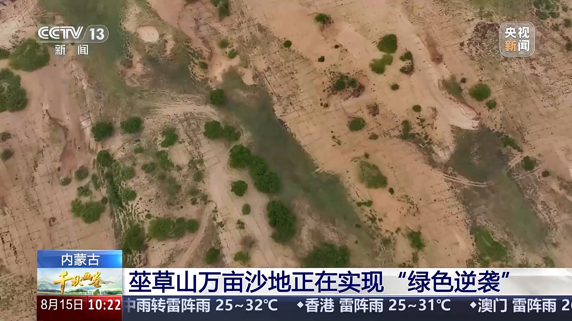 跟随卫星视角,这里是内蒙古高原东部的浑善达克沙地。莝草山,位于赤峰市克什克腾旗,由于西北风常年吹蚀,这里遍布沙丘和风蚀坑。去年5月,当地启动综合治理。通过卫星影像,我们能清晰地看到密密麻麻的草方格,如同编织的棋盘,纵横交错、紧密相连,其中很多已经萌发出绿意,牢牢锁住流沙奔袭的脚步。