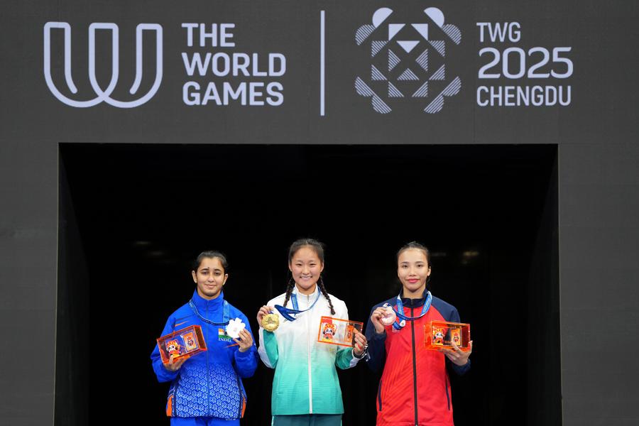 Gold medalist Chen Mengyue (C) of China, silver medalist Namrata Batra (L) of India and bronze medalist Ngo Thi Phuong Nga of Vietnam pose during the Women's Sanda -52kg awarding ceremony of Wushu event at The World Games 2025 in Chengdu, southwest China's Sichuan Province, Aug. 12, 2025. (Xinhua/Xu Suhui)