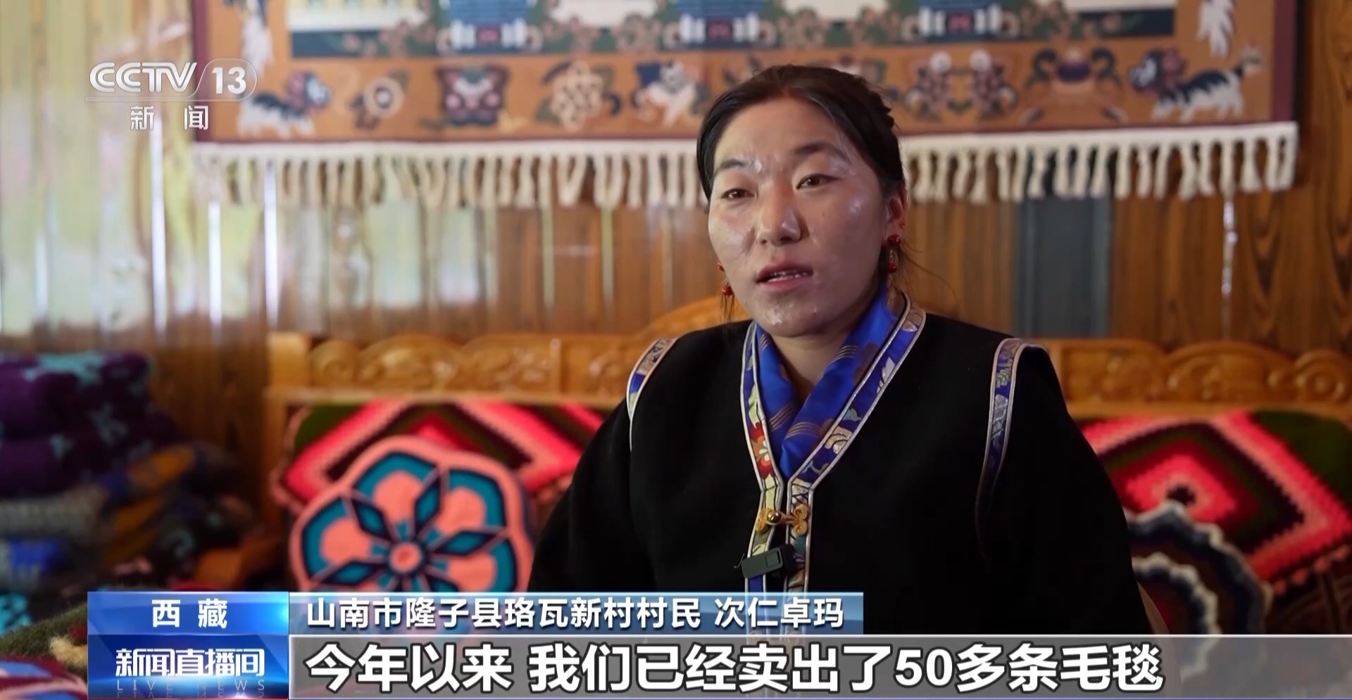 山南市隆子县珞瓦新村村民 次仁卓玛:今年以来,我们已经卖出了50多条毛毯,100多个靠枕,其中一半是通过网络直播卖出的。接下来我想把这门手艺教给村里更多的人,大家一起把致富之路越走越宽。