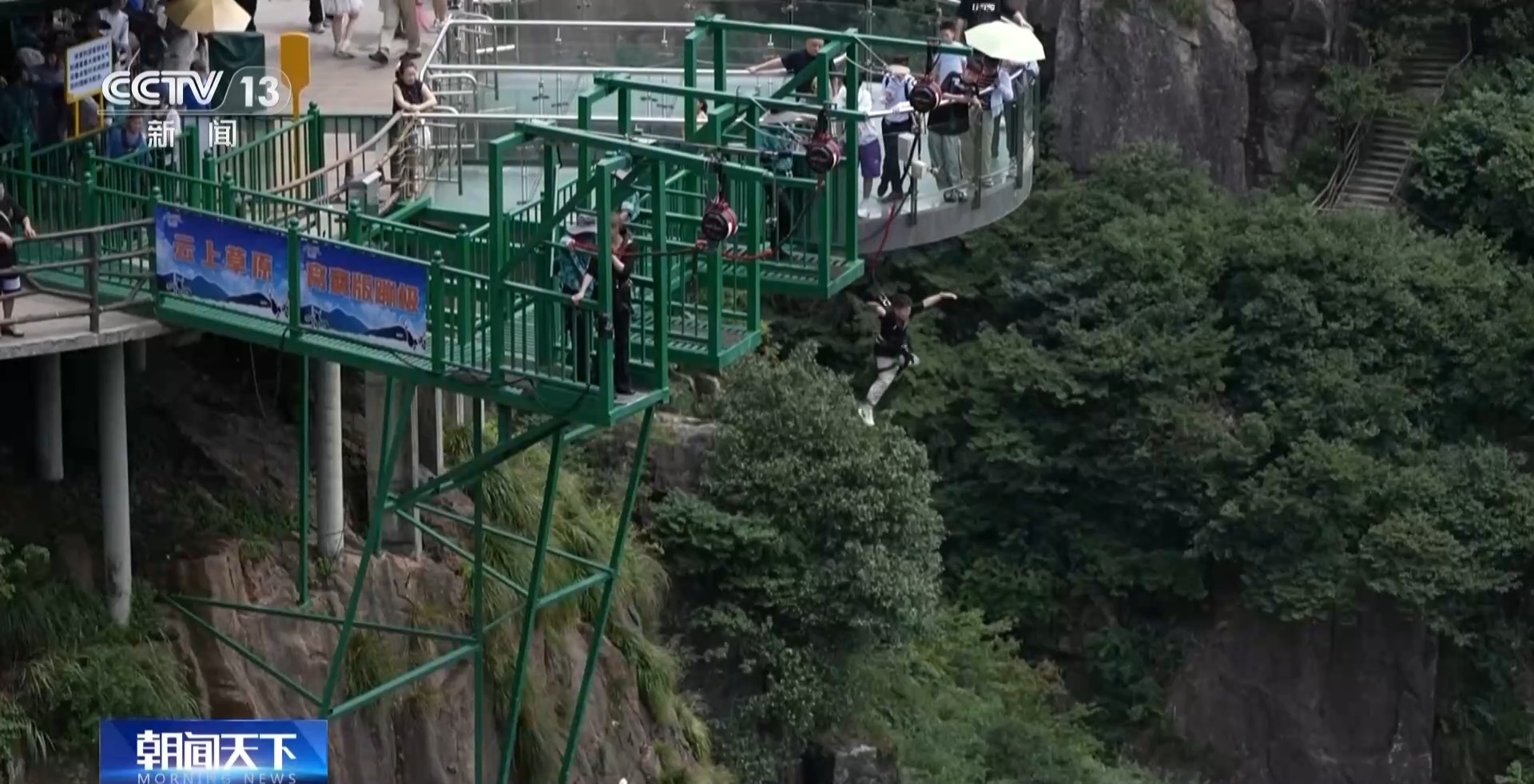 在浙江安吉云上草原景区,游客穿好装备,从高约30米的蹦极台跳下,缓慢、匀速落到地面。这个暑期,“轻松”蹦极项目日均接待游客超千人。
