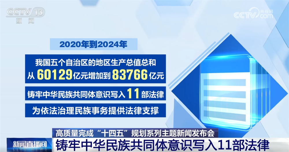 据了解,2020年到2024年,我国五个自治区的地区生产总值总和从60129亿元增加到83766亿元。铸牢中华民族共同体意识写入11部法律,为依法治理民族事务提供法律支撑。