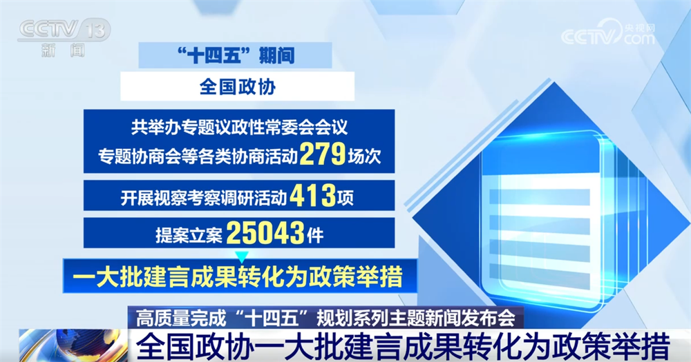 “十四五”期间,全国政协共举办专题议政性常委会会议、专题协商会等各类协商活动279场次,开展视察考察调研活动413项,提案立案25043件,一大批建言成果转化为政策举措。