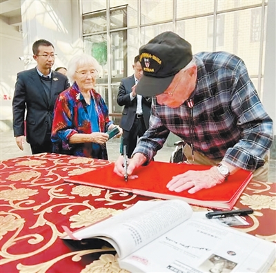 飞虎队老兵麦克马伦(右一)参观昆明飞虎队纪念馆后写下留言:“时隔80年来到昆明,看到现代昆明的巨大变化,真是太棒了。”
