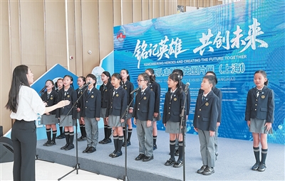 7月8日,上海宋庆龄学校学生合唱团在“铭记英雄 共创未来”飞虎队主题历史图片展开幕式上演唱歌曲《友谊地久天长》。