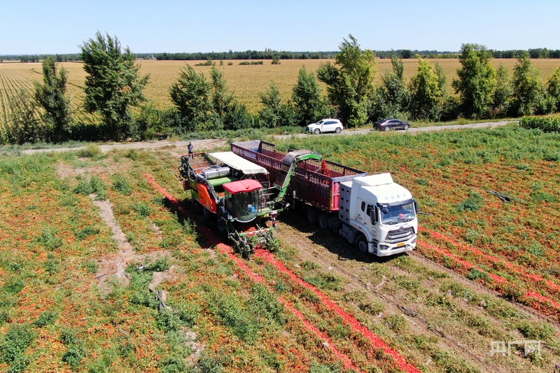 现代化番茄采收机械正在有序作业 (央广网发 吴欣昊 摄)
