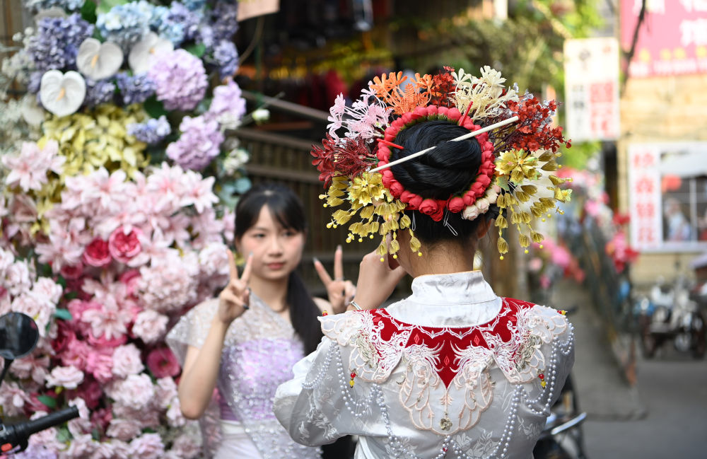2025年以来,蟳埔村推出簪花、旅拍、问海、巷遇、听音、看戏、品鲜、乐购等“八大体验”,带动文创、餐饮、民宿等业态发展,当地居民收入显著提高。目前,蟳埔村有近300家旅拍店铺,游客日均约2万人次,“簪花围”吹起的文旅热潮东风让古老渔村焕发新生。 新华社记者 林善传 肖潇 摄影报道