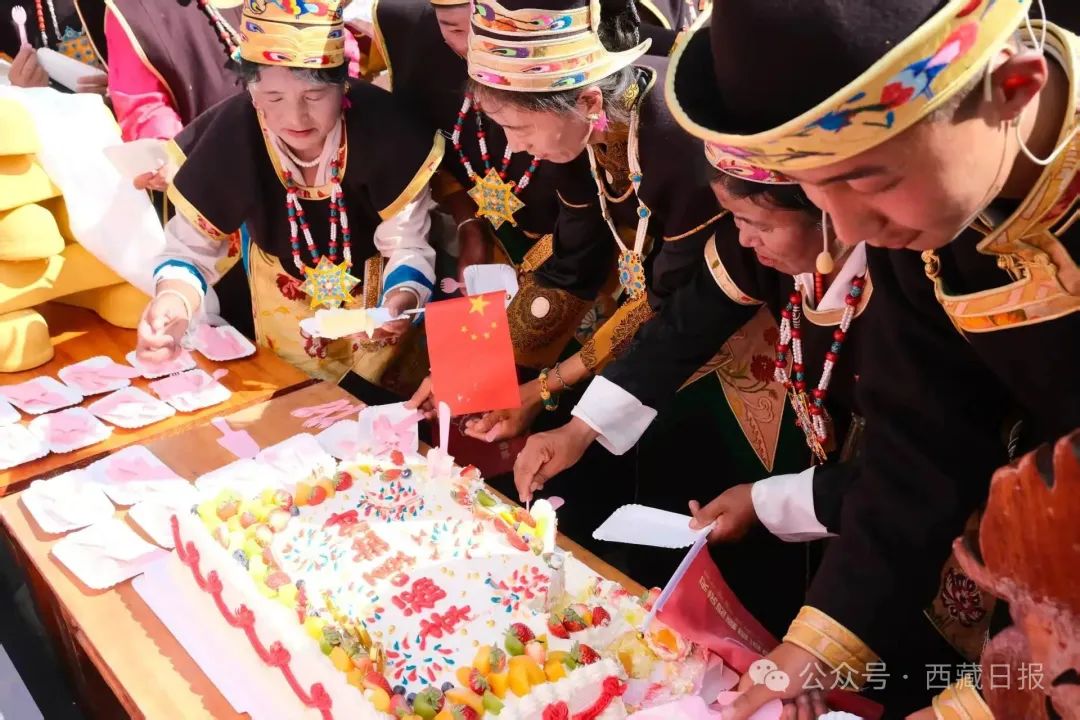 图为林芝市巴宜区林芝镇嘎拉村群众欢聚一堂,分享写有“幸福嘎拉村”的蛋糕。记者 王珊 谢筱纯 摄