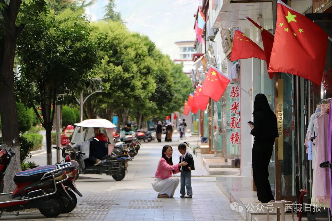 图为山南市主城区沿街商铺悬挂起鲜艳的五星红旗庆祝西藏自治区成立60周年。记者 武沛涛 通讯员 拥青卓嘎 摄