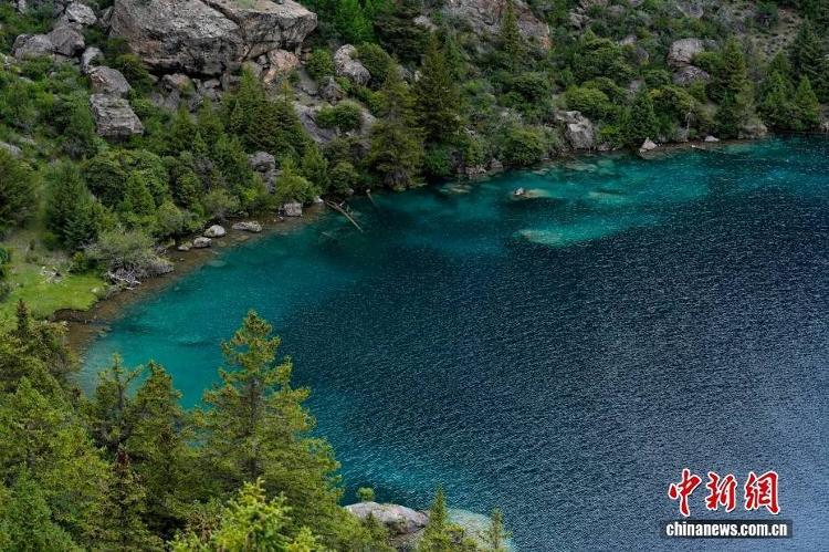 俯瞰西藏昌都三色湖风光。三色湖位于西藏昌都边坝县普玉村境内。夏日,三色湖周边郁郁葱葱,景色秀丽。中新社记者 李林 摄