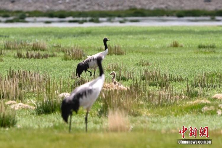 在海拔4700米的西藏自治区那曲市申扎县湿地里,黑颈鹤一家在悠闲觅食。黑颈鹤是中国国家一级重点保护野生动物,属高原特有鹤类,主要栖息于海拔2500米至5000米的高原沼泽地、湖泊及河滩等湿地环境。每年四月起,成对的黑颈鹤陆续飞抵西藏自治区那曲市申扎县,在此繁育后代。中新社记者 贡嘎来松 摄
