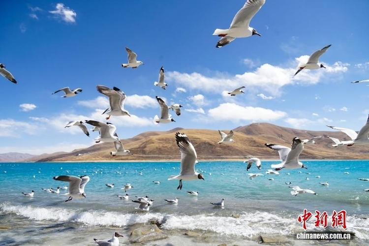 位于西藏自治区山南市境内的羊卓雍措沿岸水鸟翔集。中新社记者 马铭言 摄