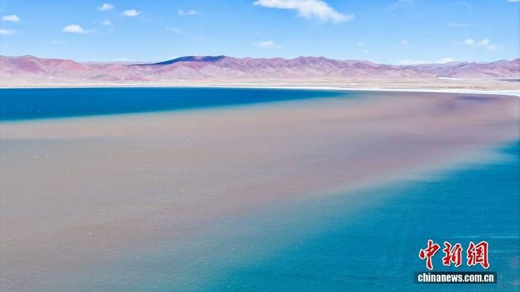 西藏自治区那曲市安多县错那湖,湖水交汇处好似“鸳鸯火锅”。(无人机照片)中新社记者 马铭言 摄
