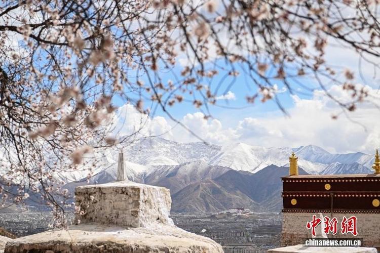位于西藏拉萨北部山坳里的古刹帕邦喀周围桃花盛开,吸引众多游客前来观光拍照。图为帕邦喀周围盛开的桃花和远处的布达拉宫。中新社记者 贡嘎来松 摄