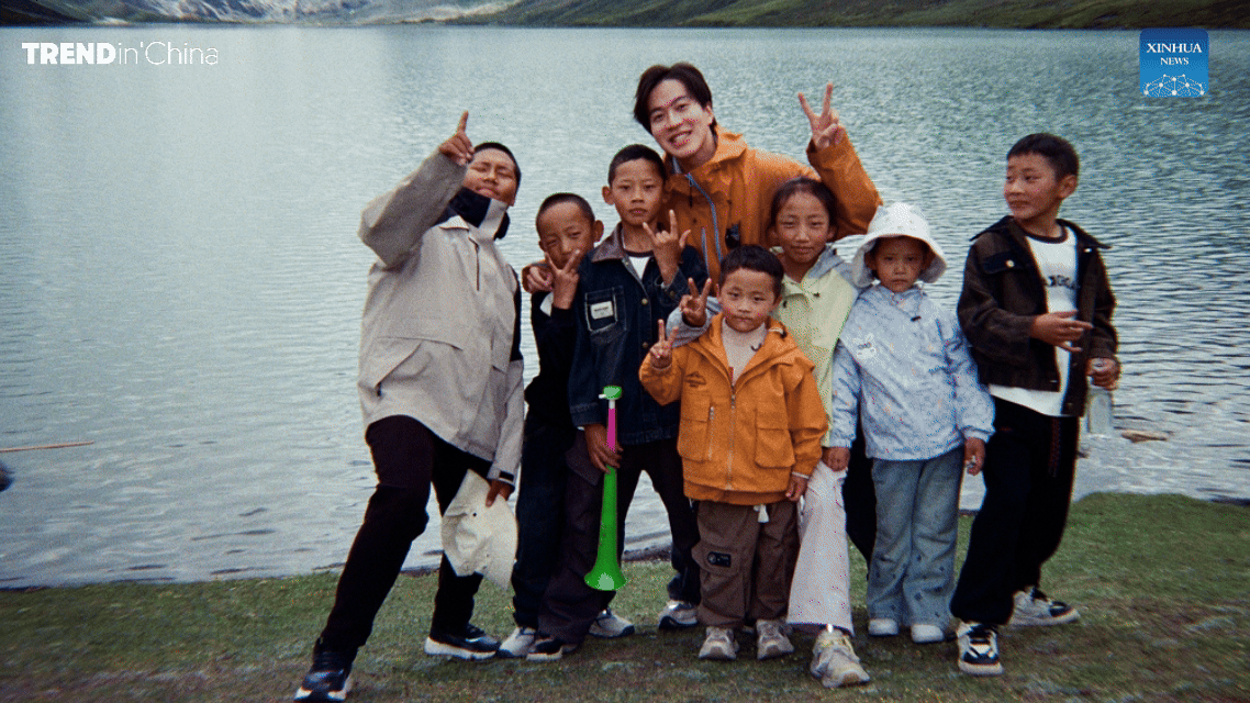 在萨普雪山下,记者与一群藏族孩童。新华社发
