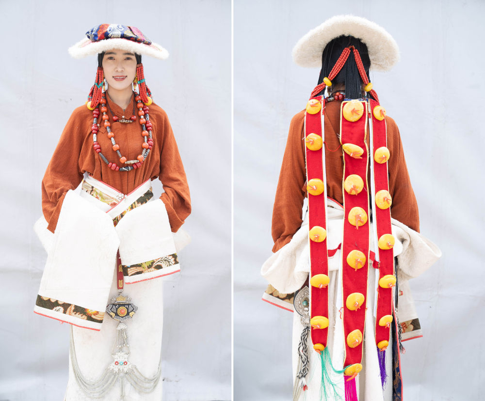 在四川省色达县,当地藏族群众穿着藏族服饰进行展示(拼版照片)。(2024年8月10日摄) 新华社记者 江宏景 摄