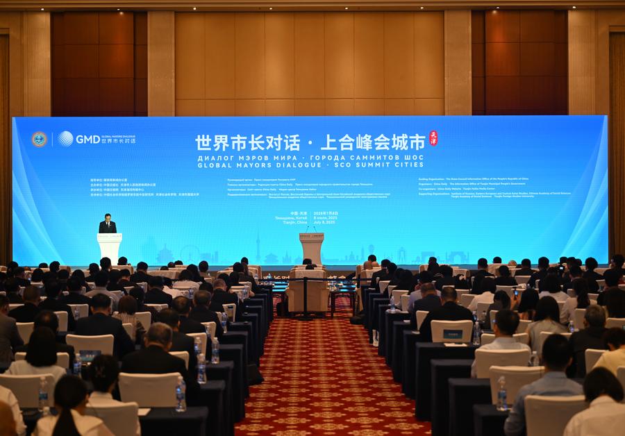 This photo taken on July 8, 2025 shows the opening ceremony of the Global Mayors Dialogue: SCO Summit Cities held in north China's Tianjin. (Xinhua/Zhao Zishuo)